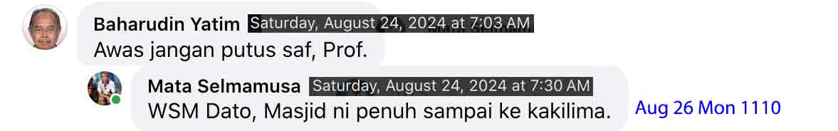 Aug 28 Wed 23 Safar 1446H, smayang subuh in Masjid Kuza, while fetching SB on D-Iman ex-Sg Merab. With that, count down of E-Day Aug-31 started.