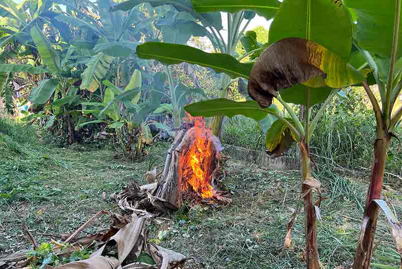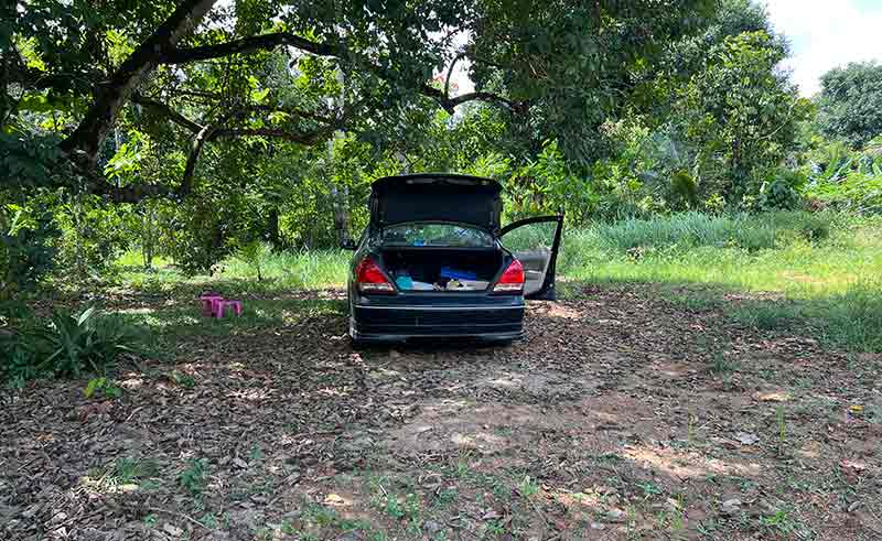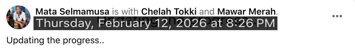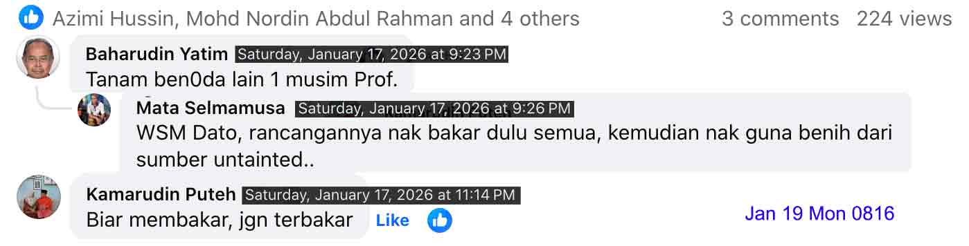 FOTOTEKSES-93 is for 2026 Jan 16-31, topping the PARALLEL, since the notorious covid has been. Monsoon in TRG might have over without a serious menace. The sea was getting calmer perhaps in welcoming Shakban to open the Ramadan 1447H. Jan 17 Sat 27 Rejab 1447H, DRV-JERTEH-TEMBILA, exclusively to P-RIMAU, in eagerness to see how the pisang was recovering. Singgah Merang, refuelling WLU. Arrived in Gong Nering, singgah Warung ND KAK YAH for a pre-lunch. Masuk orchard P-RIMAU. Samso came over to hi. For the first time, CAR WENT INSIDE THE ORCHARD, this time WLU, parked under pokok moktam, thus closely accessible when needed during mowing etc. Pisang-wise, unchanged, several tandan had gone menaced. A few new, fighting to survive. Noted however the young pokok were all gemok-green, meaning, hopeful. Work-wise basically was MOWING. Targeted area was the pisang clusters line. A bon fire was made. Mowing was successful gradually. Made fire at two clusters. Ubi planted as well. Hala balik lalu Tembila from Renek, beli keledek. Singgah Sejid Fikri, pax-ed roti-canai. Homed at past sun-set. Jan 24 Sat 5 Shakban 1447H, DRV-TEMBILA-JERTEH. Took the Tembila route to buy some keledek, and thus arriving Jerteh from Kg Raja. Peeked T-BUGIS seeing the roaming weeds that it would take pros to clean it, but noted some anak-deriang were surviving notably the MK3, and one atrributed to ASRI. Repeated-visiting P-Rimau, resuming from last week visit. The menaces on pisang did not show much of recovery even though the tree never give up fruiting. Mowing progressed to under the toklitop off a very thick lalang.