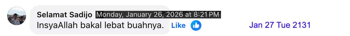 Lingered at home getting absorbed into the evolving environment. Including making efforts to maintain the house perimeter. Nonetheless Jan 10 Sat 20 Rejab 1447H in PUTRAJAYA Pr-8 accompany-ing NA for a legal matter, roamed for a meal. And Jan 12 Mon 22 Rejab 1447H in Land Office Salak Tinggi settling all the dues for this year, reminisce-ing the eatery that we frequently hang on during the KLIA-frequence-ing days ca fifteen years ago in Jenderam.