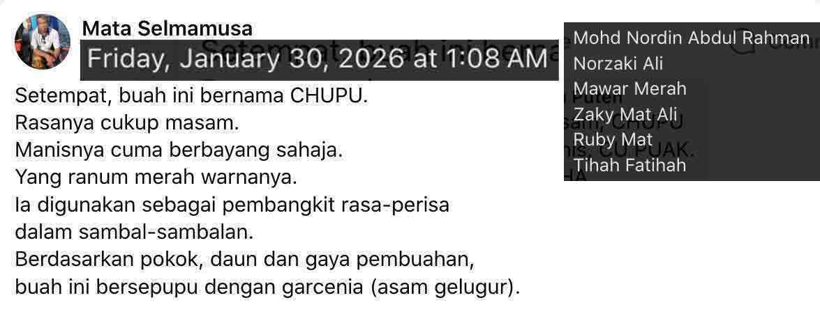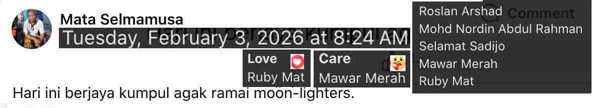 Feb 13 Fri 25 Shakban 1447H, post-Jumaat, roaming. Started with NA collecting rohaniah-karipap in Lipot, sukri-nasi-lemak in TgGelam. And kind of auditing HOMETJ for the leave. Noted the pisang trees which noticeably were fighting the mocca menaces. On to Petai Bubus, hi-ing Mek. Home finally by Jeram, part S-Link, Petaling, Tepoh, and Maras.