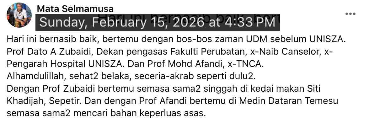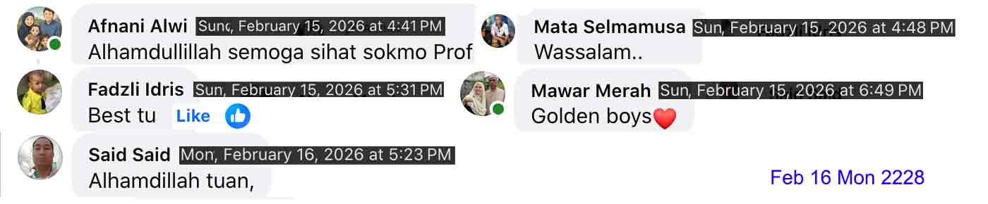 Jan 2 Fri 12 Rejab 1447H, an event in PRIMULA. Trg Bar annual dinner with a slot of appreciation for those who had served 30 years, NA was included. In the while, liaise-ing with CheLoh, and En Wan Musa in one of the Batu Buruk stalls. Updating, especially clearing a WA-chirp that the one was neither me nor Prof Mohd Zakaria Ismail.