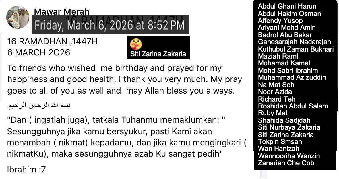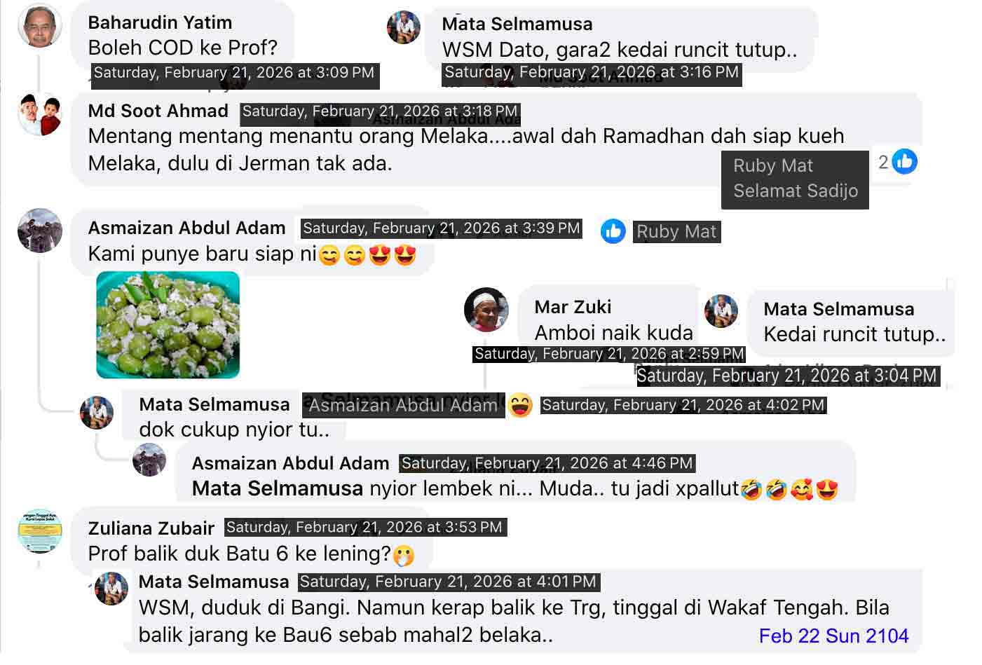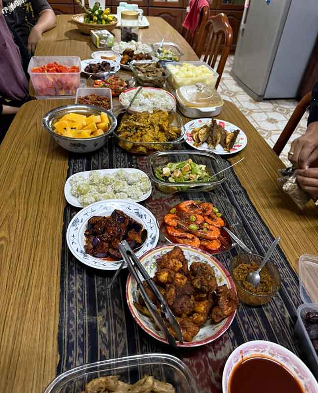 Feb 20 Fri 2 Ramadan 1447H, Ramadan-2. Ank-cu2 gathered for the iftar-2. Alya-3-beranak the first to arrive x-JB in the morning at 11. Took Adam-s for jumaat in MPI together with their Ayh-Der and Pok-Su. Malini, Ruby, and Muzani ET AL joined, arrived in that order. Muzani furnished the menu with a dish of kari ikan he cooked at last minute. Zidni et al made it the next day Feb 21 Sat 3 Ramadan 1447H, Ruby et ank2 accompany-ed. Alya-3beranak TTB-ed JB-ward the next morning Feb 22 Sun 4 Ramadan 1447H after subuh.