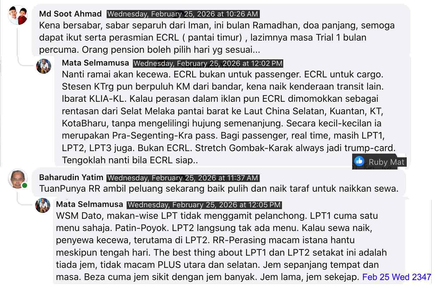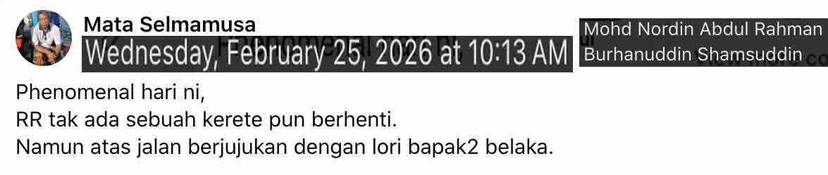 Feb 16 Mon 28 Shakban 1447H, a mission DRV-JERTEH-GUAMUSANG-KUL. It was rainy to start with in HOME-WT. It turned out raining all the way to KUL including in KL MRR2. Intermittently resided, but equally intermittently heavy. The drv was more or less a repeat of such as of 2024 Aug 1. A drop in Jerteh to deliver a package x-JB, which were miscom-ed for the deferrement since around new year. The break in Gua Musang was for smayang and refuelling. Nonetheless, a meal break was a repeat of last DRVTGG, i.e. in Genting Sempah RR. Noted pockets of traffic congestion on the opposite direction for the horse-CNY tomorrow perhaps. Home-ed in Sg Merab just enough time for the garib.