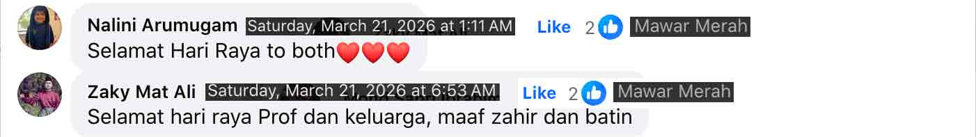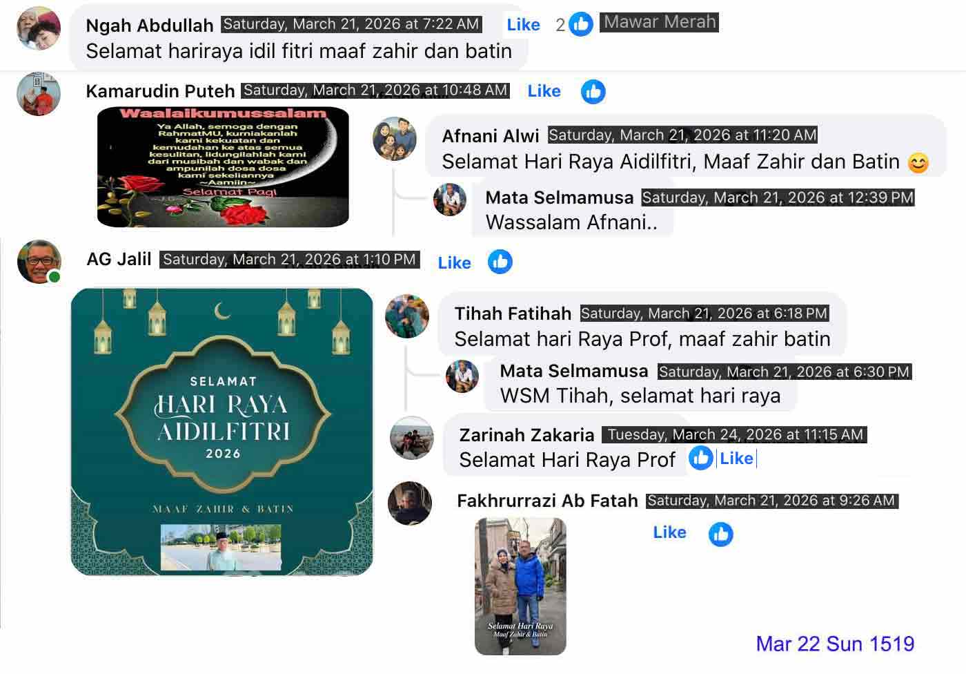 Mar 21 Sat 1 SHAWAL 1447H, Raya Idul Fitri. In Sg Merab home 4-beranak, plus Alya et al, and SBHANIS. Smayang in SNR. Early visitors were Prof Nash et al, and Rozana. Passing the noon, Malini et al dropped by x-Meru to bye SBHANIS en route to Marang. And Malini left. Zidni et al arrived, he said x-KualaSelangor. Hanging ramai2. Munirah et al, then Fina et al arrived and joining. Lepas asar all retreated. Shawal-1 was closing with the closing of the day which weather-wise was a fine day.