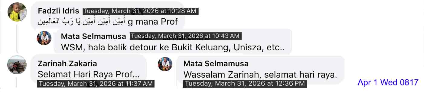 Mar 28 Sat 8 Shawal 1447H, Today is RAYA NAM. The day usually the folk ziarah KUBOR. I went to both of my mother and father in Kalang Arang, and of Azizah in Paya Datu. Another open house. That of Prof Nordin FIK nearby in W-Tengah. SBHANIS joined. Both left for Marang, en route to iKEROH, in the evening after giving a helping hand in fixing the peripheral pipe leakage. With that the Shawal with ank-cu2 ended.