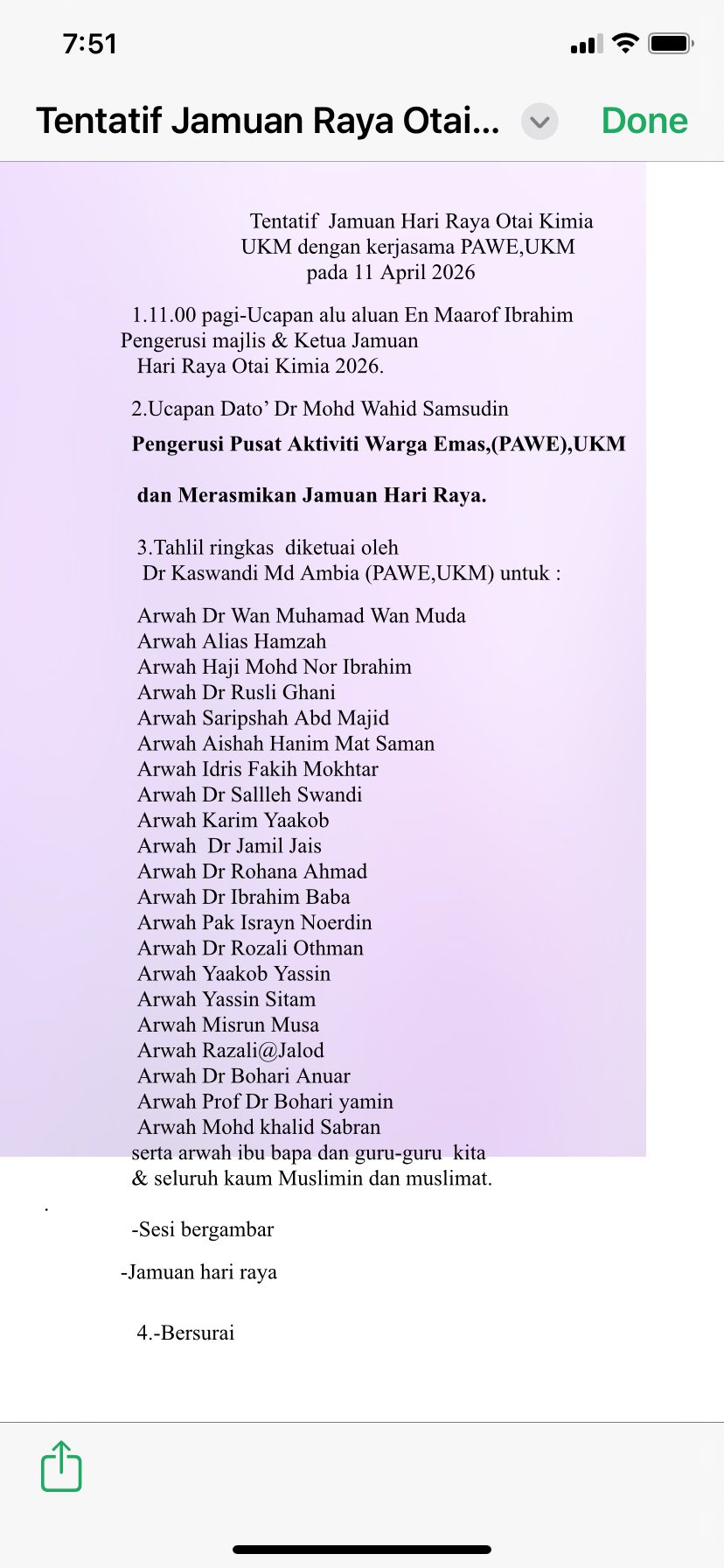 Apr 11 Sat 22 Shawal 1447H, a walimah in the heart of ULU GOMBAK. Villa Rimba Flora. That of Prof Dato' Zubaidi, a colleague of UDM heydays time especially in KOTA, the wedding of his daughter. Joining constant buddies Dr Che Abdullah and Roslan an RO in Tembila FBIM. Related today was in TER TRG, the RU of SMK Padang Midin, said to cover all batches. In Putrajaya, SAS-SSAS open house, also covering all batches. And in UKM Bangi, the Chemistry otai, the founding batch were getting together including to remember those already arwah.