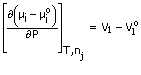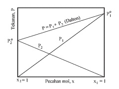 ISIPADU Bagi sistem unggul, mengikut Raoult: Dari segi isipadu, maka (¶m1/¶P)T,nj = V1 - isipadu separa molar komponen-1 Jadi, apabila kita membuat campuran, perubahan keupayaan kimia komponen-i adalah: ![]() Daripada takrif keupayaan kimia, µi = µio + RTlnai = µio + RTlnxi, maka, µi - µio = RTlnai = RTlnxi dan ¶(µi - µio) = RT¶lnai = RT¶lnxi Jadi, bagi pencampuran unggul, ![]() Oleh sebab Dengan perkataan, isipadu separa molar komponen-i dalam campuran unggul, adalah sama dengan isipadu molar komponen-i tulen. Apabila berlaku pencampuran unggul, isipadu jumlah campuran adalah hasil tambah isipadu masing-masing komponen.