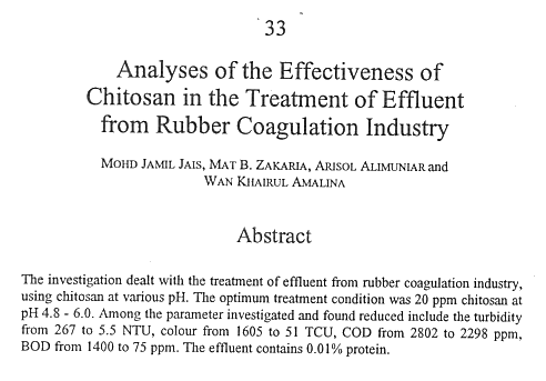 11 Mohd Jamil Jais, Mat B. Zakaria, Arisol Alimuniar & Wan Khairul Amalina. 1995. Analyses of the Effectiveness of Chitosan in the Treatment of Effluent from Rubber Coagulation Industry. In Mat B. Zakaria, Wan Mohamed Wan Muda & Md Pauzi Abdullah (Eds.), Chitin and Chitosan - The Versatile Environmentally Friendly Modern Materials pp. 289-296. Bangi: Penerbit UKM. (Proc of the Asia-Pacific Chitin and Chitosan Symposium, 1994 May 24-27. Bangi: Biro Rundingan & Kembangan [Bureau of Consultancy & Extension] UKM). Chem. Abs. 123(24): 321191s (1995).