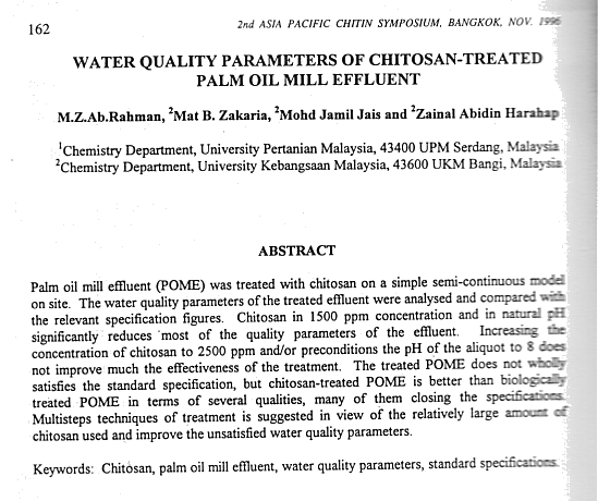 12 M.Z.Ab. Rahman, Mat B. Zakaria, Mohd Jamil Jais & Zainal Abidin Harahap. 1996. Water Quality Parameters of Chitosan-Treated Palm Oil Mill Effluent. In Willem F. Stevens, Mukku Srinivas Rao & Suwalee Chandrkrachang (Eds.), Chitin and Chitosan - Environmental Friendly and Versatile Biomaterials pp. 162-168. Bangkok: Asian Institute of Technology (AIT). (The Proc of the Second Asia Pacific Symposium on Chitin and Chitosan, 1996 Nov 21-23. Bangkok: Bioprecess Technology Program, Asian Institute of Technology).