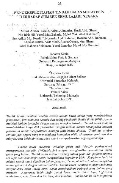 3 Ambar Yarmo, Arisol Alimuniar, Rusli Abd Ghani, Nik Idris Nik Yusoff, Mat Zakaria, Mohd Zaki Abdul Rahman, Nor Asikin Mohd Nordin, Normala Abdul Rahman, Rusuan Abdul Rahman, Khomah Ismail, Alias Muda, Rozita Osman, Man Ghani, Abd Rahman Sulaiman, Yusof Itam & Mohd Nor Ibrahim. 1993. Pengeksploitasian Tindak Balas Metatesis Terhadap Sumber Semula Jadi Negara. Dlm. Muhamad Yahaya et al. (Pyt.), Dua Dekad Penyelidikan Sains Bahan, Tenaga dan Hasil Tabii hlm. 208-231. Bangi: Penerbit UKM. ISBN 967-942-241-0. (Prosiding Persidangan Penyelidikan Universiti Kebangsaan Malaysia. 1990 Ogos 27-30. Bangi: UKM).