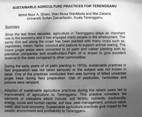 oo Mohd Nor A Ghani, Wan Musa Wan Muda, Mat Zakaria. 2011. Sustainable Agriculture Practices for Terengganu. Proceeding of Sustainability Conference, 2011 Nov 23-24. Ri-Yaz Heritage Marina Resort and Spa, Duyung, Kuala Terengganu. Eco Terengganu. Abstrak.