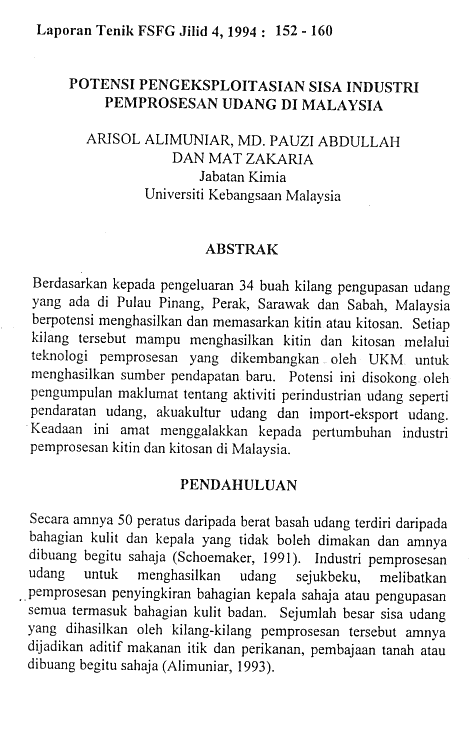 9 Arisol Alimuniar, Md. Pauzi Abdullah & Mat B. Zakaria. 1994. Potensi Pengeksploitasian Sisa Industri Pemprosesan Udang Di Malaysia. Dlm. Bohari Mohd Yamin & Baharudin Yatim (Pyt.) Laporan Teknik FSFG 4: 151-160. Bangi: Fakulti Sains Fizis dan Gunaan, UKM. (Prosiding Kolokium ke-7 FSFG. 1994 Mac 28-29. Bangi: FSFG).