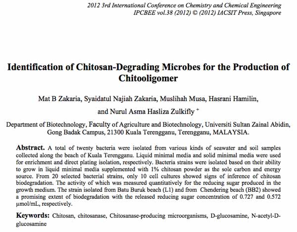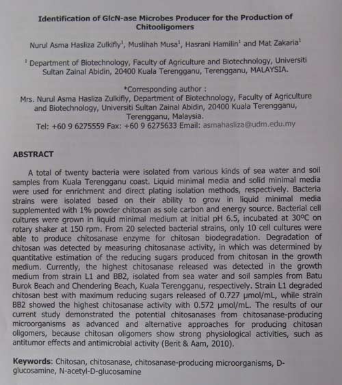 oo Mat Zakaria, Syaidatul Najiah Zakaria, Muslihah Musa, Hasrani Hamilin, Nurul Asma Hasliza Zulkifly. 2012. Identification of Chitosan-Degrading Microbes for the Production of Chitooligomer. Proceeding of 3rd International Conference on Chemistry and Chemical Engineering (ICCCE 2012). 2012 Jun 29-30, Jeju Island, South Korea. Asia-Pacific Chemical, Biological & Environmental Engineering Society (APCBEES). IPCBEE 2012, Vol 38, 127-131. Abstrak, PDF.