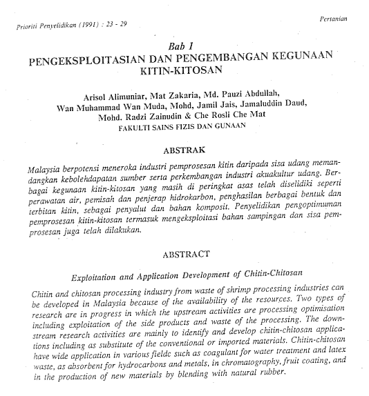 1 Arisol Alimuniar, Mat Zakaria, Md Pauzi Abdullah, Wan Muhamed Wan Muda, Mohd Jamil Jais, Jamaluddin Daud, Mohd Radzi Zainuddin & Che Rosli Che Mat. 1991. Pengeksploitasian dan Pengembangan Kegunaan Kitin-Kitosan. Dlm Zakri A. Hamid et al. (Pyt.), Prioriti Penyelidikan untuk Kemajuan Sains dan Teknologi hlm. 23-29. Bangi: Penerbit UKM. ISBN 967-942-210-0 (Prosiding Bengkel IRPA-UKM Pertama. 1989 Sep 2-3. Air Kroh, Melaka: Urusetia IRPA UKM).
