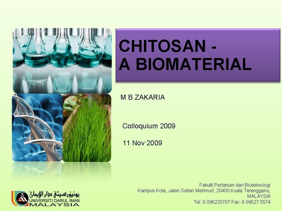 00 Mat B Zakaria. 2009. Chitosan - A Biomaterial. Faculty of Agriculture and Biotechnology Second Colloquium. 2009 Nov 11, City Campus, Universiti Darul Iman Malaysia, Kuala Terengganu (MY). 2009 Nov 11.