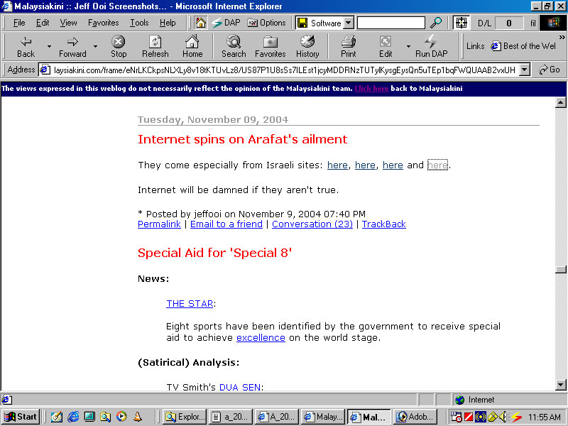 Undoubtly, the event of the year was the freeing of DS Anwar on Sep 2 Thu by the Federal Court judges Datuk Abdul Hamid Mohamed and Tengku Datuk Baharuddin Shah Tengku Mahmud (the third judge Datin Peduka Rahmah Hussain, dissented) in the Palace of Justice in Putra Jaya; excatly 6 years after he was dismissed, arrested, beaten to an inch of his life, humiliatingly convicted and jailed in Sg Buloh prison. He flew to Munich immediately during the weekend to have his acute back injury treated. Chronology of Anwar's plight; also here, here, and here. He returned home on Oct 31 (exactly a year after Tun MM steped down) to resume or rebegin his leadership career. It clouded a bit the UMNO 2004, 21-25 sep in PWTC general assembly in which Datuk Seri Abdullah Ahmad Badawi (5th PM since 2003 Oct 31) and Datuk Seri Najib Tun Razak (the TPM, since 2004 Jan 7 Wed) were elected uncontested President and Deputy, respectively.