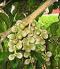 This year, the dokong, planted in the same year the house was constructed (1985), began to give us their sweet langsat-duku combination. This is the remaining few of the trees that we planted that give us the fruits. It was grown from the seeds, the fruits of which was brought here by the house builder Pak Zid from his home town in Pattani, Thailand. From the two kilos of fruits that Pak Zid brought to us, several seeds were germinated in two discarded paint-cans; when they were sufficienly strong and enough number of leaves, they were transfered per se to the plot at two different locations; however, they grew up at a different rates; the slower one was inhibited further by the frequent manace of the hanuman langur to the resultant size-wise of 1 to ten. We are waiting, and we are also waiting for the duku, the baby of which was the one that survived from the forty odd we brought from Terengganu in early 1990's; and the langsat (two trees) we planted from the babies given to us by Pak Etek of Sungai Buah at about the same year; |