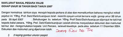 ![]() My own count down to the inevitable retirement began today, 2004 Nov 30 Tue, when I recieved the reminder from the registrar, and asking to submit several documents for them to proceed: it would be 2007 Apr 20 Friday; which ever comes first, completed 56, to exit the UKM, to begin the new, most probably the last, phase of life.