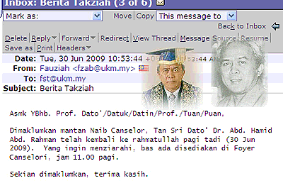 It was during the recess in the middle of the meeting dealing with the accomodation of my faculty's student, and that of the FTM, with the medical faculty's students, that I received the mail. He was such a proud VC, assuming the office in 1984 from Prof Awang Had Salleh who went to 'kick-off' UUM.