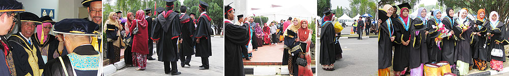 More of those I have met noticed my presence. In the Q to greet were the dean of Islamic Studies, Prof Zakaria Stapa, who used to joke in 2007 Mar about my being needed in Trg. The dean of Engineering, Prof Marzuki, and the dean of Social Science, Prof S Mastura. The Information Centre Director, Prof Othman Karim. Dr Kadderi, Dr Idris Endut, Prof Mohd Shafeea Leman, and Prof Burhanuddin. And some more greetings with the eyes only.