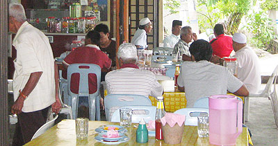 ![]() 2010 Jun 6 Sun 23 JAkhir 1431. Multi-breakfast in an old stall, unperturbed by "development", near Manir. Almost unlimited choice. Nasi lemak bilis, nasi lemak ikan aya, nasi dagang, nasi kerabu, khasidah, mi goreng, mi hoon, and multitude of hot drinks, and many more on the display without a proper name. Missing was my favourite, pulut ssambal. Incidentally, at the nearby table, someone was closely watching us enjoying the cuisine. Who eventually took everything that was on the table on him. |