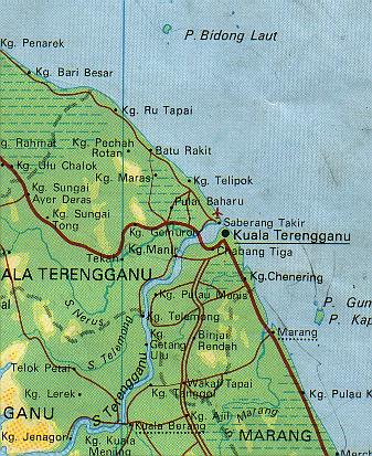 The southern and western part of Kuala Terengganu were foreign lands to me when I was below ten. My father and my mother had many known relatives as far as Pahang to the south, and Kuala Berang to the west, but in my kiddy years we had never been to the area. Kuala Berang is to the west, about forty kilometers away. But I had been only up to Bukit Payung, fourteen kilometers from Kuala Terengganu. I remember my father took me once to Pak Madah, two kilometers off Bukit Payung, to visit his one and only maternal auntie, and it was a feast time, wedding or something. Bukit Payung only became very familiar to me in 1965 and 1966 when I was in Secondary School in Padang Midin, about four kilometers before Bukit Payung on the main road. Within that two years the area became my new loci, then already well connected with tarmac roads, including in the area off the trunk road such as Paloh, Durian Burung, Kuala Bekah, Pulau Musang, Sungai Rengas, and Pengadang Baru, through into the interior between the two rivers including Manir itself, Teluk Pasu, Tebakan, Pulau Bahagia (previous name, Pulau Babi), Batu Hampar, Telemong, Kesom, Beladau Kolam, Beladau Selat, and Jeram. By then I had added more friends, from the school. My first arrival at Kuala Berang was in 1973, with a fellow-state friend I met at the University, Jamaludin, who asked me to accompany him, apparently to visit his girlfriend. In my adult years, I went to or passed by this western areas more than the northern areas. In fact I practically abandoned the northern areas, even if I went to Kelantan, or comming from Kelantan I would use the coastal route, connecting Batu Rakit, Merang, Penarik, Setiu, Semerak to Pasir Putih.