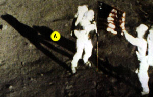 11: The shot of Neil Armstrong and Buzz Aldrin planting the US flag on the moon's surface was taken by a 16mm camera mounted on the Lunar Module. Aldrins shadow 'A' is far longer than Armstrong's. Yet the only light on the moon - and the only light source used by N.A.S.A. - comes from the sun, and should not create such unequal shadows. |
