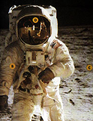 11: Buzz Aldrin stands with the sun shining down across his left shoulder. Although his right side is in shadow, there is too much detail shown on that side of his space suit 'B'. It should be much darker and less visible because the contrast between light and dark is much greater on the moon. With no atmosphere to pollute the light on the moon, all the photographs should look bright and crisp. But the landscape behind Aldrin 'C' gradually fades to darkness. This 'fall-off' effect, hoax theorists say, should not occur on the moon. But the fading effect could have happened because film is less adaptive then the human eye and makes objects seem darker the further they are from the camera. There is a curious object reflected in Aldrin's visor 'D' (circled in red but hard to see in this small picture). Some theorists think it is a helicopter, others say it is a 12-metre glass structure. N.A.S.A. claim it is a piece of equipment on the lunar surface. |