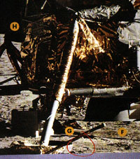 14: As the Lunar Module Antares, from Apollo 14, rests on the moon's surface there is is no crater beneath it's fet 'F', despite the considerable amount of dust that would have been thrown up during its descent. There also appears to be a footprint 'G' directly under the module, yet no-one walked on this part of the moon before the craft landed. On the left of the craft, the words 'United States' 'H' are clearly visible, whereas they should bein shadow. Buzz Aldrin himself said that there is no refracted light on the moon which points to the fact that another source of light was used to take this shot. |