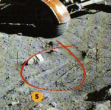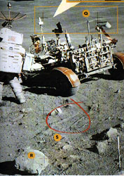 ![]() ![]() ![]() In this photograph of John Young (panel above) readjustingan antenna next to the Lunar Rover Vehicle (L.R.V.), there is a marker, known as a cross-hair (top left in this panel) 'Q', that goes behind the LRV's equipment. These cross-hairs which appear on all the lunar photographs, are made by a screen of cross-hairs placed between the shutter and the film. The bright, reflected light may have obliterated the fine line of this one, or it could have happened if the image was retouched. The foreground shows what looks like the letter 'c' on a boulder (top right in this panel) 'R'. Is this perhaps an identification letter left on a studio prop? The tracks made by the LRV's wheel turn rather oddly at right-angles 'S' (above middle in this panel). These tracks could have been caused by studio technicians pushing the buggy into place. Such clear tracks and footprints require moisture to form and should not appear on the dry lunar surface. |