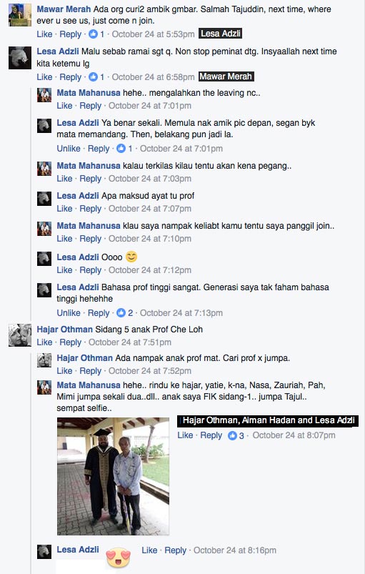 It was Oct 22 Sat, for Syarbini, in Universiti Sultan Zainal Abidin, Kuala Terengganu. Its 8-th. Went in, for the first time since leaving the place in 2014 Feb, and thus to be in the hall was a waste of time. Instead, I lingered on with my ghosts around the place. Ostensibly, with the old pals of my favourite. The base staff. NA proactively accompanied, and Zidni et al too, all the way from KUL for his brothers and sisters. It was a gloomy day, pre-monsoon, cloudy, but was blessed with a rainless. It's six sessions in three consecutive days Sat to Mon. CB was in the first session. I was told since early in the morning, that Pro-Chancellor would proceed in Chancellor place.