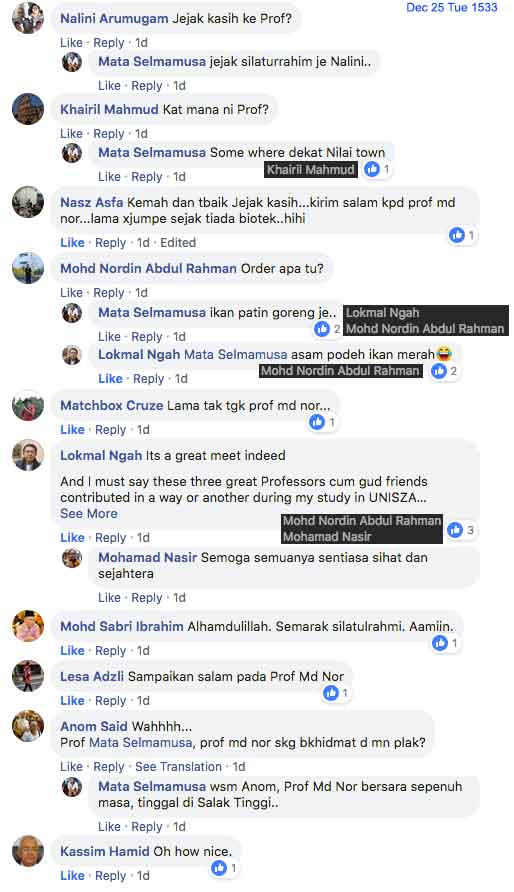 The feasting continued. Dec 23 Sun, acoompany-ing Lokmal and Che Lah visiting Md Nor in Salak Tinggi. Four of us have the common denominator of UDM-UNISZA. In particular, Lokmal, a FRIM staff, he's a PhD graduate of Unisza, the first, 2012 conferment, since the birth of UDM in 2006. The visit ended in an eatery in Nilai vicinity, said to be highly Nismilan in nature.