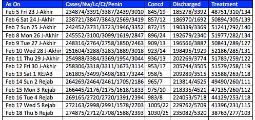 Feb 18 Thu 6 Rejab 1442H, ending MCO 2.0-3, the pendamic was very much around, with the daily positive still in the thousands. Expectedly, the MCO was extended, and re-categorised among the states. The CONDITIONAL (Bersyarat), the RECOVERY (Pemulihan), and the pedigree MCO which was imposed on the capital states. Most of the rest were on CONDITIONAL. Perlis was the only state under RECOVERY. However, bona fide citizen could not differentiate which is which with regard to the inter-district, and inter-state movement since nothing was retracted from before. Police verification still needed even for the inter-district movement practically throughout the country. The extension was launched, a 2w-quantum of MCO 2.0-4 from Feb 19 Fri 7 Rejab to end on Mar 4 Thu 20 Rejab 1442H. |