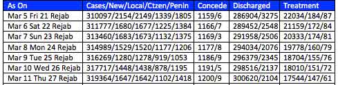 Mar 18 Thu 4 Shakban 1442H, end of MCO v2-5. The MCO was continued by MCO v2-6 with the respective categories according to the state. But the overall inter-state movement was still not allowed. |