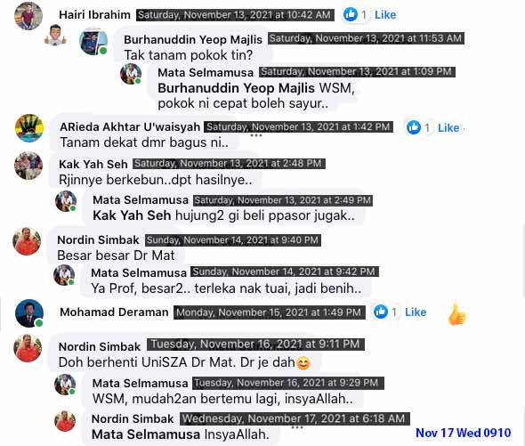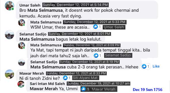 Oct 18 Mon 11 R-Awal 1443H, Sabri MokTehPah passed away, in the mids of still menacing pandemic, in Pontian Johor. It happened so sudden giving a shock to sanak-saudara and waris-waroh, especially his ank-isteri who needed to compose themselves. Oct 19 Tue, DRV-JERTEH. The main target was T-Bugis. Cutting down tall trees to give sufficient free volume to the durian to absorb the sunlight.