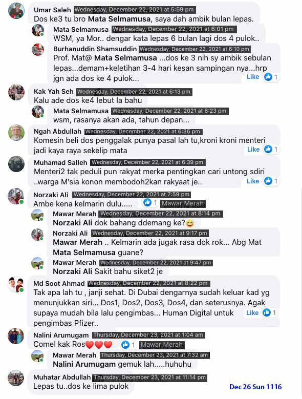 Alya hp-ed that they were leaving for JB. In the media it was shown that Selangor was sunken by the non-stop rain since Fri morning. And in the media also, it was clear that GPS, the Sarawak-BN-version, had gained a landslide majority in the PRN. Dec 20 Mon, DRV-KUL, homeward, but while in SG PETANI, detoured to TANJUNG DAWAI the site of SEA PRODUCES, equivalent to the Seberang Takir asal. Noted the originality was preserved, the modernisation being added when necessary only, unlike the Seberang Takir. Dec 21 Tue, got the BOOSTER at PK-Cahaya in P-8. The place was not a PPV, it's a purely private clinic perhaps being outsourced. No wonder now the noises of the vaccination had died down. And understanding that millions of CT-zens were to be vacc-ed, no wonder during the early vac days, the noise was so thunderous.
