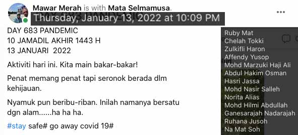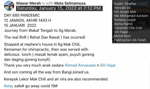 2022 Jan 19 Wed 16 J-Akhir 1443H, concluding the Paya Datu Chapter. A 0730 return-hp from Kamal in Tok Jembal, telling the sad news that CHEK had passed on just ca an hr and half ago at Pok Shang house in Tok Jembal. Put up the news in the FAMILIA after NA insisted that we all were going to attend the funeral. All were on the embark-drv, including SB in Ayer Keroh, to rendz with CB in Sg Merab. The task, DRVTGG ASAP. Managed to setoff 0926, in TAV with ASRI accompany-ing. Noted in the w-msg taking off were ALYA et al (0850 ex-JB), SB (0936 ex-Ayer Keroh), ZIDNI et al (1127 at Bentong toll), RUBY et al (1020), MALINI et al (1054), MUZANI et al, and SB-CB (1146). Arriving at the yard (1506), preceded by Ruby, followed by ZIDNI, ALYA, MALINI, MUZANI, SB-CB. And by 1820, all gathered in TOK JEMBAL Home, all 34 pcs of us. All were staying through to Jan 22 Sat, except Malini who returned on Jan 20 Thu.