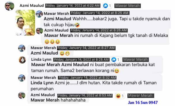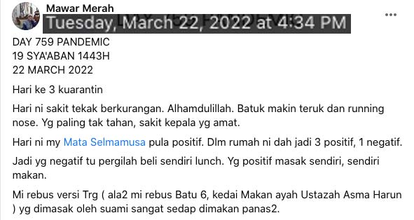 Alya commn-ed that CB, ASRI were fine in PULAI MUTIARA, JB, helping in the DIY of the eatery. However, Mar 13 Sun ALYA w-msg-ed that Farhan's mama was +ve, in a home-test prior to her routine check-up. But Alya said a repeat test was with the reverse result. Mar 14 Mon, SB drove off back to AYER KEROH, and on check-ing in his office he was told that he was a kontek-rapat to a +ve colleague during his pre-drv-SgMerab last Fri night. Mar 15 Tue, the first thing in the morning SB was arranged by the Company for a PCR. And by ca 4 pm, he w-msg-ed the results he got. +VE, which means that the whole family in principle were kontek-rapat, except Muzani et al. Since the gathering on Sat, all of us had been to every where, including to two walimah. In the FAMILIA, Mar 15 was full of msg of managing the infectivity. Ruby made the first test, and was -ve. That was the first good sign since she was among the closest to SB in the weekend gathering. |