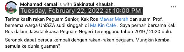 2022 JAN 1 SAT 27 J-Awal 1443H, attended POK SID's walimah at his home in Taman Mutiara-Permata, W-Tengah. It was the resumption of the deferred Dec 11 Sat occasion scheduled in Anees Homestay, Tanjung Gelam. Met ex-colleagues Prof Manaf, Prof Zubaidi, and Prof Shukri, after just missed Prof Che Abdullah, and Dr Abdullah. The weather was a blessing for PokSid. Windy, cloudy, non-rainy, and non-sunny, a good climate for a rendezv.