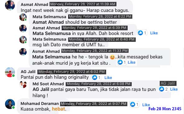 A very strong monsoonic wind was blowing from the night of Feb 23 Wed. The next day Thu, the rain was just sporadic, but the wind was accelerating up. Fri, the day turned dark, very strong wind, felling some branches, the sea was dangerously choppy, the waves relentlessly pounding the beach, and at night, the pour, all night. Sat morning, the scenery changed into the field of water, and the rain was getting heavier, pouring like the sky was falling. All rivers and streams, and lowlands had swollen beyond the banks. In W-Tengah the swollen drain had reached a few inches on the floor of g-floor. Sat was the day of agony. A DRV-SETIU was all in the rain, to-and-fro, and while having the feast of aqiqah of Nasaee's #1daughter. People initially endured the torrent, but expecting a couple of days 'harmlessly'. Feb 27 Sun, the wind died, the rain subsided a lot, but the hinter-rain water reached the residential areas downstream. K Berang was hit by a severe flood, like that in Klang Valley, last year 2021 Dec. Some houses were sunken, leaving only the roof. All TRG hinterland, including in Kemaman, and Dungun, were flooded. Rescue operations were broadcasted in the media. Feb 28 Mon started with a calm morning, the clouds were thinning. Some blue background of the sky were appearing. But from the sea, some rains were still expected. Nonetheless, the day proceeded with sunshine, the sky was blue-er, and the sea was a lot tame-er. The rain was practically subsided. The fishermen was always predicting right, Mar would settle the torrent of Feb. |