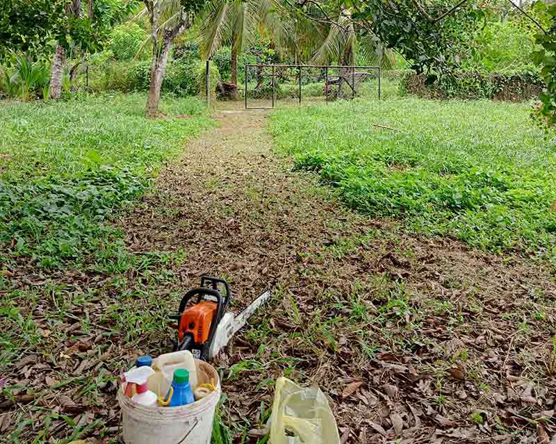Jul 12 Wed 23 Z-Hijjah 1445H, DRV-JERTEH, solely to P-Rimau to touch up the mow-ed orchard, to make less obstacle in the next mowing time. It thus basically pruning. Making bon-fire. On arriving the initial task was to mow the access, detouring on the opposite nebor's lot, so the the car could access close to the gate for easier unloading-loading. Noted the three tandans of kelat, none was tua enough to harvest. Instead at the leaving time, a new kelat was planted, the bud taken from the first cluster. So far only the first cluster produced the tandan. The rest three hopefully follow suit. And the 5th to grow alike.