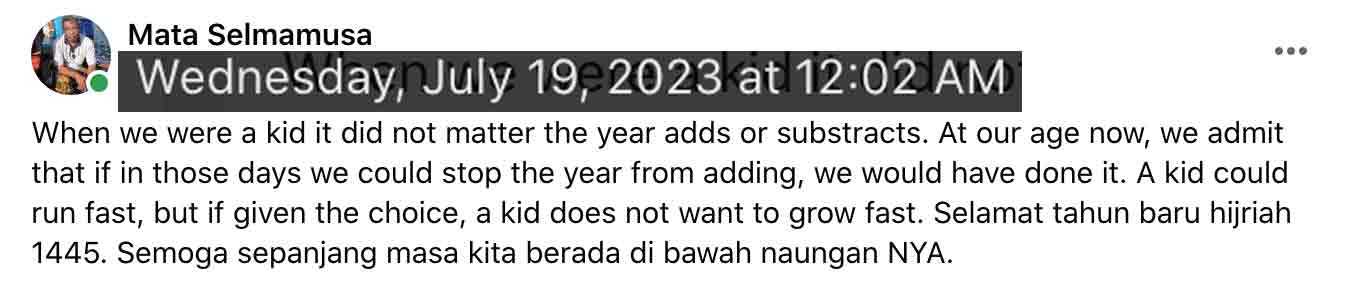 Jul 19 Wed 1 MUHARRAM 1445H, was the Awal Muharram Malaysia break. In the afternoon ank-cu2 gathered in Muzani's place in Sect-3 for a cake-ing and makan2 event. Being in the middle of the week, sans were Alya et al, and SB. They both made it up Jul 21 Fri 3 Muharram 1445H. And left Jul 22, and Jul 24 respectively. SB somehow re-HOME-ed, Jul 25 Tue 7 Muharram 1445H evening, saying he had a bad back-ache.