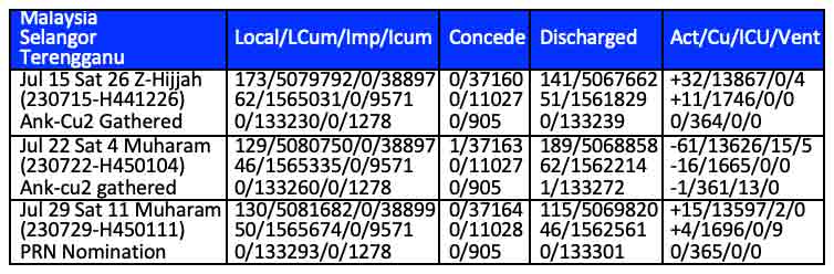 Jul 16-31 covid, the accompany-ing FOTOTEKS-es was MCO-F5-33, topping the previous COVID-MCO-es. The SOP of face-masking had died down. Noted the weekly data showed a very near zero death, and below 100 active. TRG was green already.