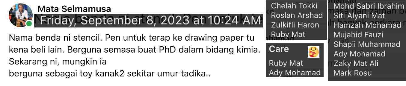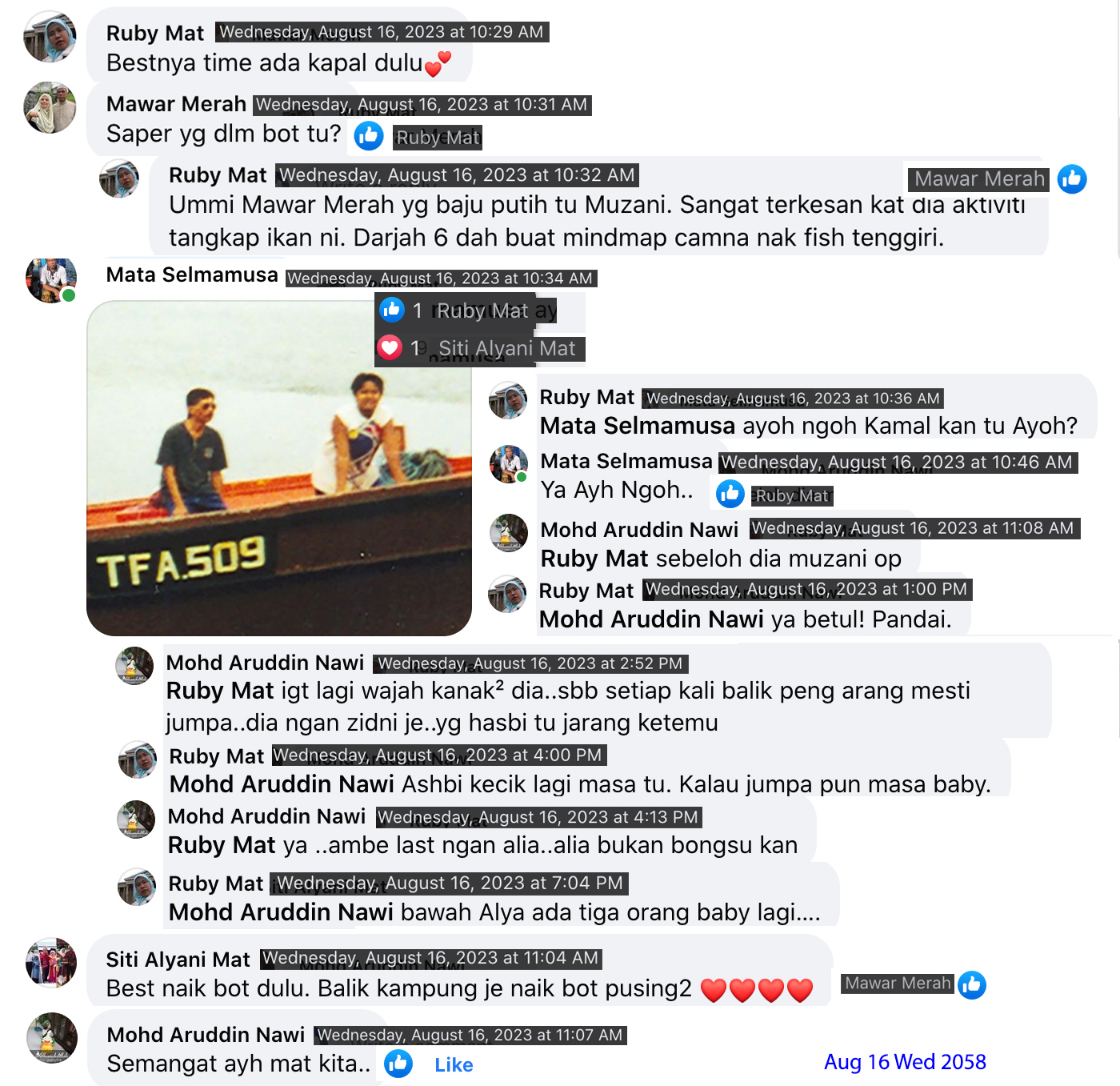 Aug 5 Sat 18 Muharam 1445H, the RU-4-Q for Padang Midin Alumni SPM 67/68 in AM TRANSIT INN off the LTSM. Aug 6-8 Sun-Tue 19-21 Muharam 1445H, lingered around about the homes, and the vicinity. Including accompany-ing NA to KTS/KMI, servicing TV in Bukit Berangan, and tidy-ing TJHOME. Aug 9 Wed 22 Muharam 1445H, accompany-ed Che Lloh seeing Ismail Musa in Tumpu Kuza. Met also Fakro, and Jo-Sadad, and Junior SAS-ian Jafar Bajuri. Detoured to PKB, FISHING. Quite a good landing, but the cold box had nearly full for Aug 12 DRVKUL.