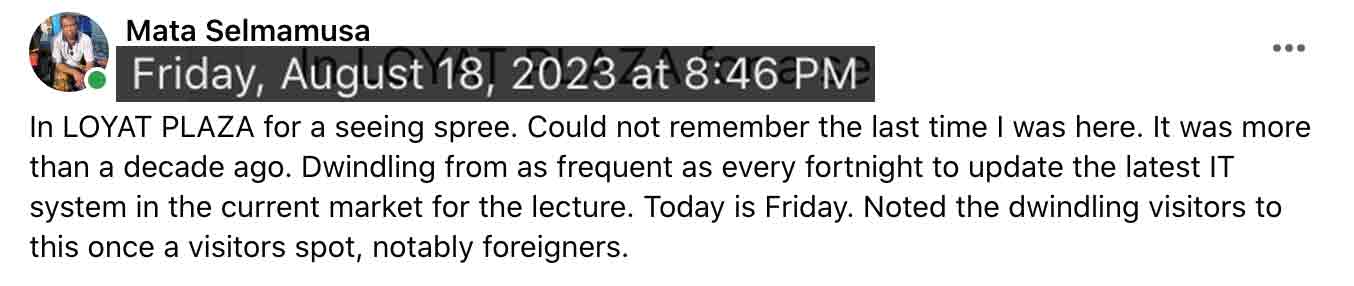 Aug 18 Fri 1 SAFAR 1445H, a seeing-spree with CB in LOYAT, while delivering NA to DBP for a BAR-DBP BM-related activities. Had not been to Loyat perhaps in decade. Noted the dwindling visitors. Noted also on the way around the vic, the Pudu Prison had transformed into a Bukit Bintang City Centre. And such a change at the traffic re-alignment at the historic junction of Pudu-BukitBintang.