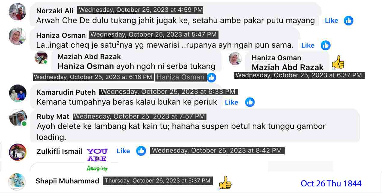 Oct 13 Fri 27 R-Awal 1445H, in the Morning Bazaar in MARAS. My star-attraction here at the moment was kepok made in Tok Mir, KEPOK ATANLIZA. Singgah immediately on arrival. Sembang with the staller. Started with duduk-mana. Batu-6. Ayh-Li. He said he's anak-sedara MOKSU, he said MokChik to him. He was ALYAS NGOH POK KATOK, and more surprise cucu TOK SU KARIN, where in kiddy time he always visited, thus knew me, even my exact local name, SOMAD, and parents and top siblings. The talk reflected into the old days of Kalang Arang, when TokSu, Pok Ngoh, Pok Li were our dependable immediate neighbour together with PokNgohWeil-MokLong. His cousin Usop MdNong. He was born in 1956, and went to SK Bkt Tunggal as well. He knew AbgRa, and Num. Currently staying in PokKatok the same place as where Zzali came from. Married, for the second time 3y ago to a TEPOH-an. In all the chat, I could not remember a pinch of the memory with him. Ended up beli KEPOK, TAPIR pulut, and an FOC tapir-ubi.