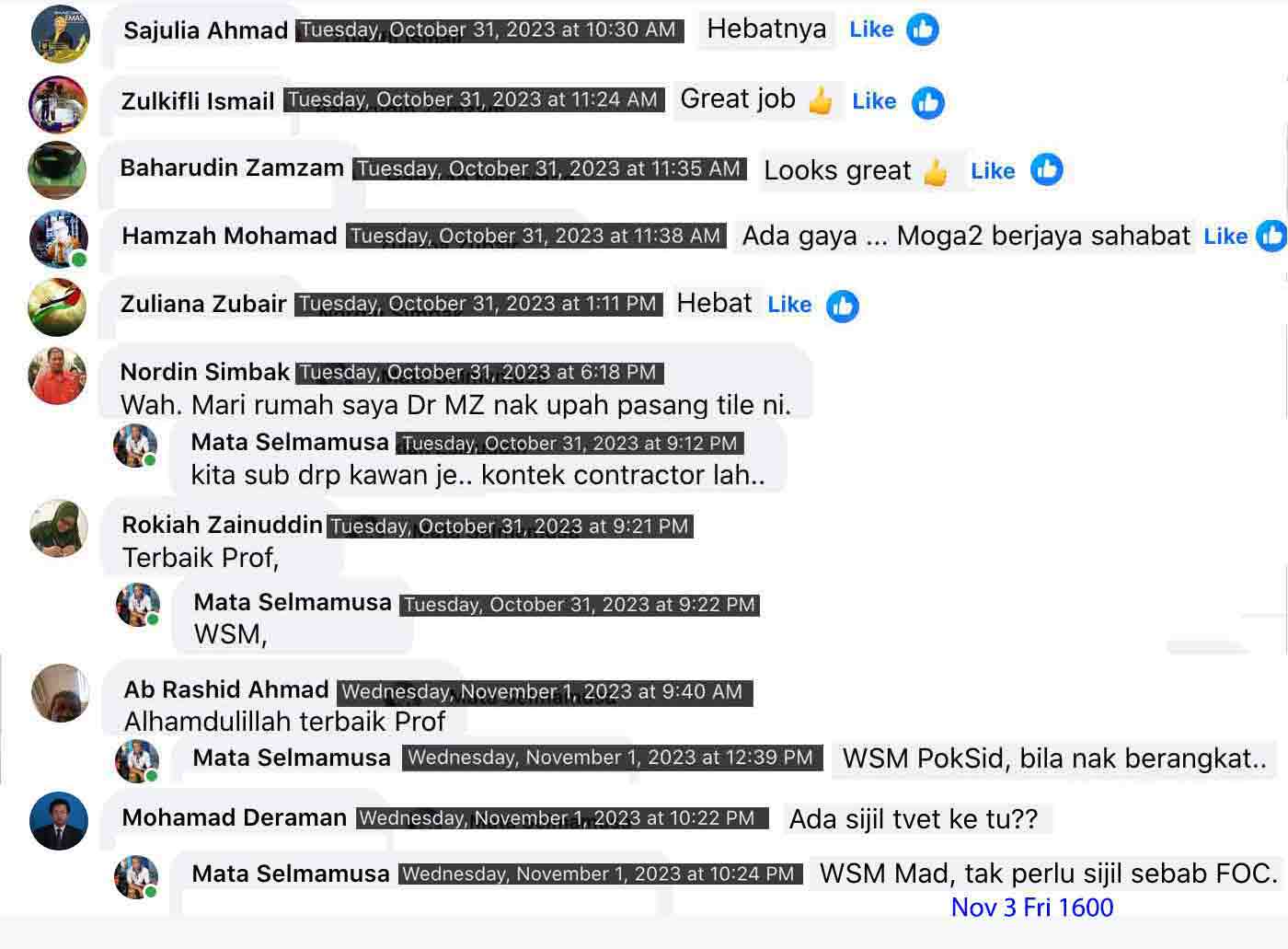 Oct 28 Sat 13 R-Akhir 1445H, in TJHOME, pakat 3-beranak embarking on a DIY of re-tiling the R-3 floor which had partly exploded. It took through the rest of Oct, maximising the availability of CB-ASRI, especially for the hacking of the base concrete, and mixing the simin-gam. NA had all the time with her BAR matters, weaving with delivering the afternoon provision.