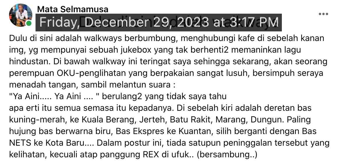 Weather-wise, Sg Merab in early Dec was not much different from W-Tengah. It's wet most of the time with a similar pattern of rainy evening through to the night. House perimeter could not be adequately maintained. Dec 14 Thu 1 J-AKHIR 1445H, DRVTGG in TAV with NA. Two or three tasks to be accomplished in TRG before new year 2024 appears. Traffic was favourable, making the drive conform the the bench mark of six-and-half hr, including a 55-min refreshment in Gambang RR. However the weather was rather dreary. No sunshine at all through out. A dull, cloudy day from Sg Merab, and rainy after Gambang RR, very heavy in Paka vic. However the rain subsided on arrival, that the bazaar in Pok Tuyu was seen alive. Signs were abundant that it had been rainy for the past several days. The home in W-Tengah was surrounded by water, small plants like anak-betik, were all drowned.
