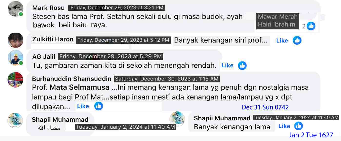 Dec 22 Fri 9 J-Akhir 1445H, post-Jumaat, a ngekoh cucu HJ MAN Alumni SMKPM-SAS, and mem CG Jamnah, in their place in the vic of Masjid Wakaf Mesu. Hi-ed one WAN MUDA, my much senior home-lad during my growing up time in Kalang Arang, a prominent figure during afternoon frolic by the river, as I remembered in early 1960-s. Razali, Hasnah, Noriah et al were also joining.