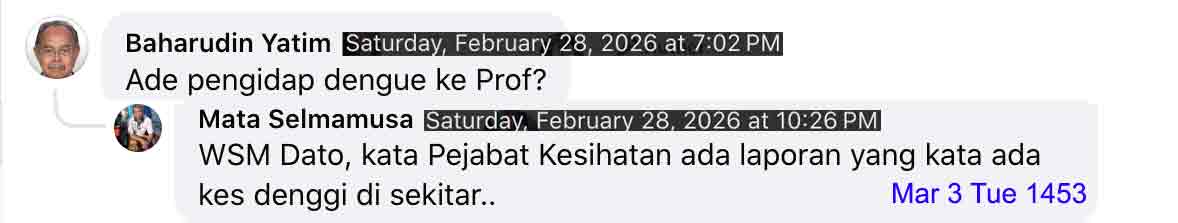 Mar 6-11 Fri-Wed 16-21 Ramadan 1447H, the week of waiting for NA to accomplish matters c/o TrgBar, one time in Telaga Daing, and another in Tiang Kulat. Then to DRVKUL. Mar 6 Fri, singgah Surau MatCher in Batu-6 which comprises the kubur in which my father's father was buried. As much as I remembered my father never missed visiting his father grave on every Ramadan eve and Shawal eve. I have not info at all on where my father's mother was buried. I believed my father never forget his mother grave. Buried also here was my very much loved little sister Aini who passed on when I was very much in kain batik recuperating. Had a full opportunity in the week time in joining the jemaah zohor in the afternoon in Sejid Lipot. And teraweh at night with NA. One time Mar 8 Sun18 Ramadan, joining solat f-jenazah after teraweh. One time jemaah asar Mar 11 Wed 21 Ramadan to catch the AMIL who did not appear. Noted Mar 10 Tue 20 Ramadan a tragic passing in Tembila of a staff of UDM. Tajul Afif Abdullah.